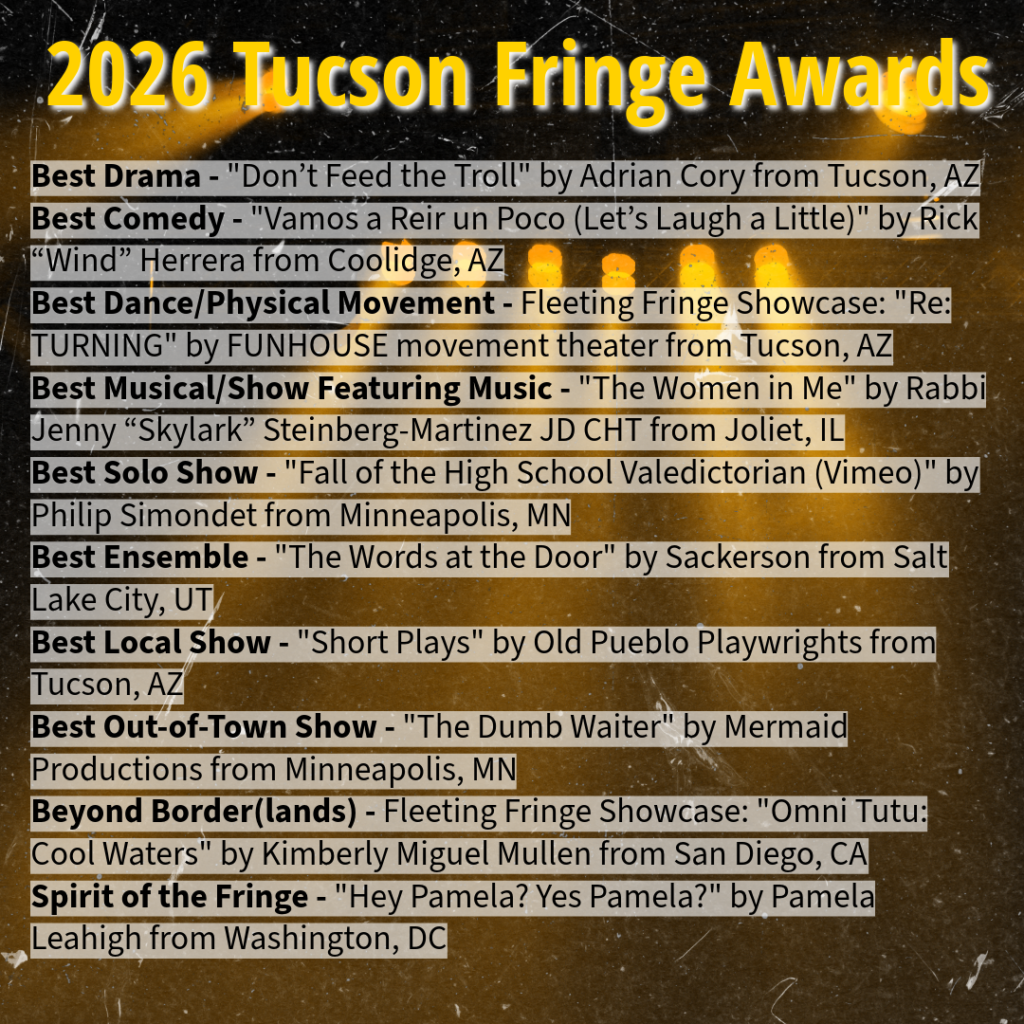 These are the winners of the 2026 Tucson Fringe Festival Awards. If you know any of the folks who worked on these shows, be sure to congratulate them. All the shows we had this year were deserving of awards and we hope to have just as many amazing shows at the next festival.
